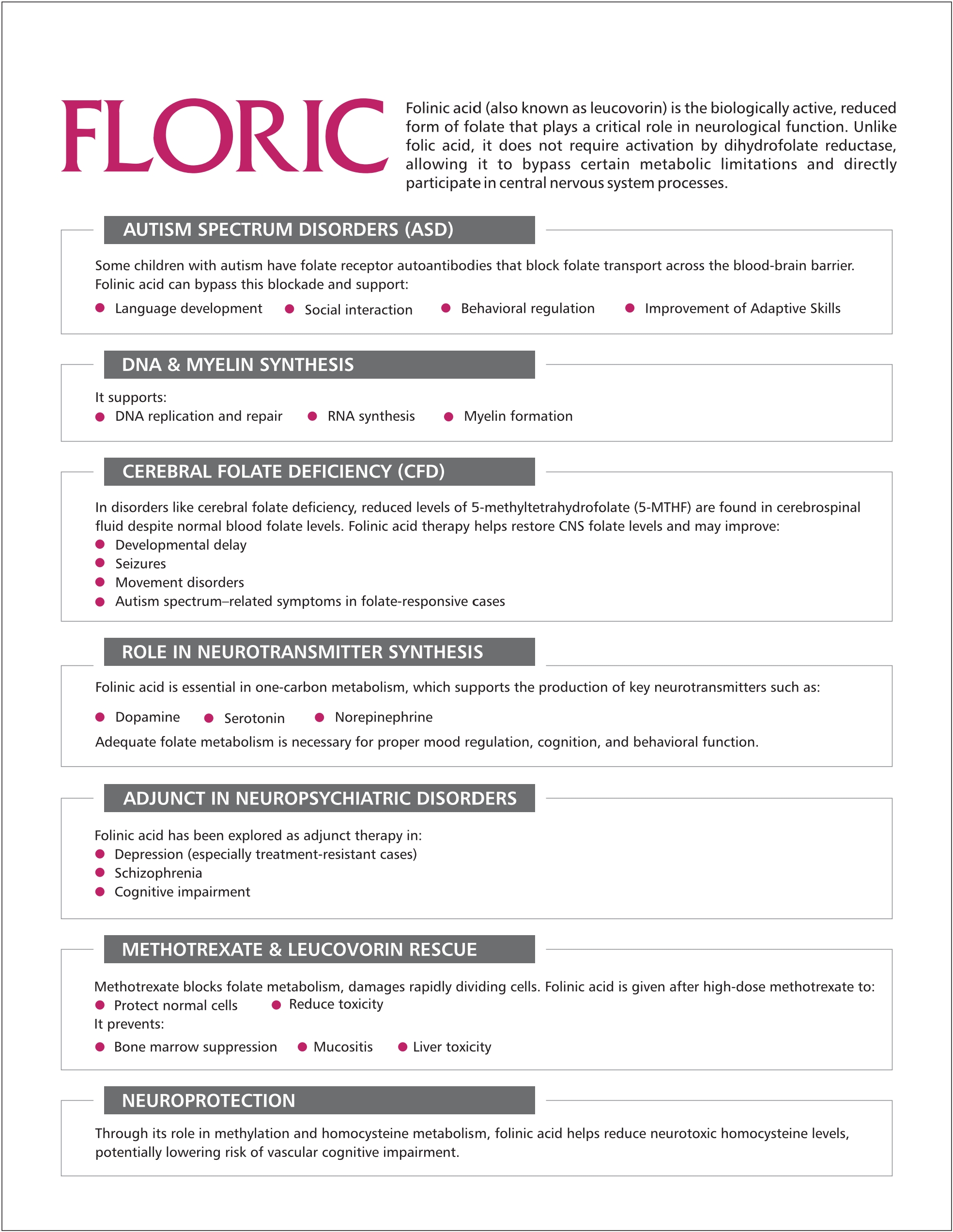 Folinic acid (also known as leucovorin) is the biologically active, reduced form of folate that plays a critical role in neurological function. Unlike folic acid, it does not require activation by dihydrofolate reductase, allowing it to bypass certain metabolic imitations and irectly participate in central nervous system processes.